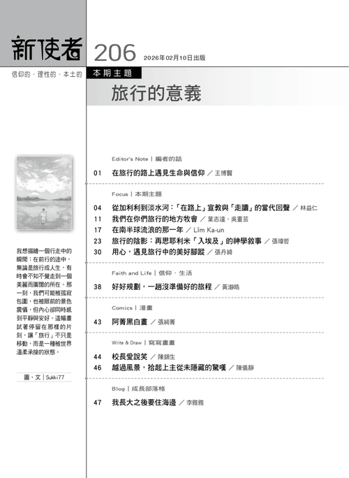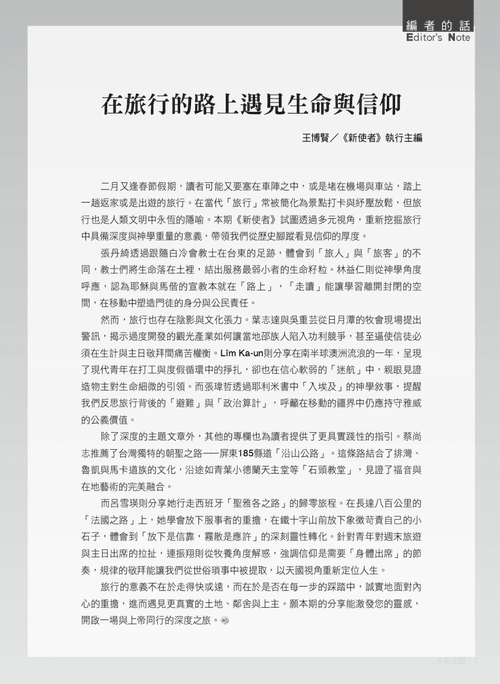 二月又逢春節假期,讀者可能又要塞在車陣之中,或是堵在機場與車站,踏上一趟返家或是出遊的旅行。在當代「旅行」常被簡化為景點打卡與紓壓放鬆,但旅行也是人類文明中永恆的隱喻。本期《新使者》試圖透過多元視角,重新挖掘旅行中具備深度與神學重量的意義,帶領我們從歷史腳蹤看見信仰的厚度。