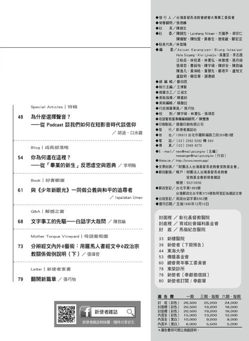 在實踐中,沈介文在主題文章中記錄《女宣》這本刊物如何成為婦女的集體生命史,讓隱而未現的故事在文字中獲得尊嚴與傳承;K 則在《耕心》週刊面臨百萬赤字的現實下,仍相信真實的生命故事比抽象教條更能觸動人心。而Ispalakan Umav 則在好書櫥窗中介紹《少年新眼光》讀經手冊——不僅是靈修工具,更引導青少年在數位資訊紛雜的處境中尋求公義與和平,成為引領新世代追尋普世價值的信仰導航。