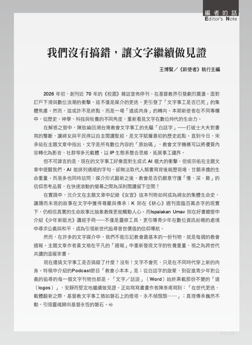 2026 年初,創刊近 70 年的《校園》雜誌宣佈停刊,在基督教界引發劇烈震盪。面對訂戶下滑與數位浪潮的衝擊,這不僅是媒介的更迭,更引發了「文字事工是否已死」的集體焦慮。然而,這或許不是終點,而是一場「道成肉身」的轉向。本期新使者在不同專欄中,從歷史、神學、科技與牧養的不同角度,重新看見文字在數位時代的生命力。